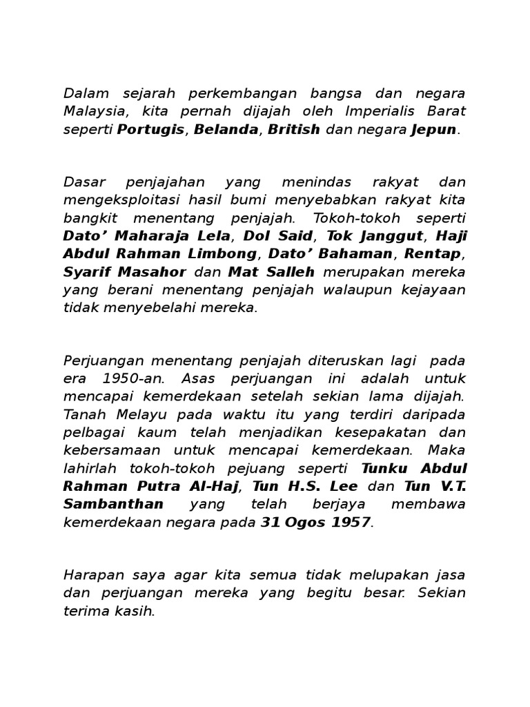 Umno, dipimpin oleh tokoh moderat yang kharismatik tunku abdul rahman, bersama mca dan malayan indian congress kemudian berkoalisi dan. Namun, dibalik itu semua terdapat pesan moral tentang perjuangan dan kemerdekaan yang tak boleh terlupakan oleh kita dan generasi penerus bangsa. Blog ini dikhususkan kepada pelajar untuk faedah bersama. Pada januari 1956, abdul memimpin misi ke london untuk menegosiasikan kemerdekaan melayu. Perjuangan dato' maharaja lela sesi: