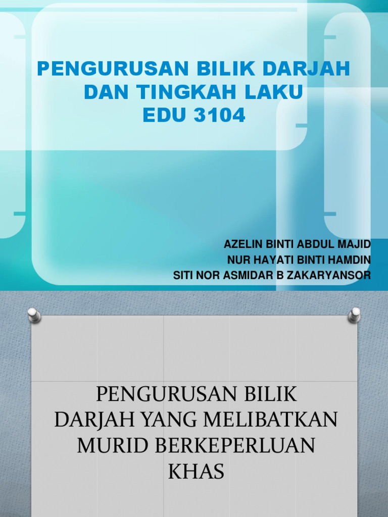 Peranan Guru Dalam Pengurusan Bilik Darjah from image.slidesharecdn.com Perbezaan di antara bilik darjah biasa dengan bilik darjah pendidikan khas dilarang plagiat. Oleh itu, guru memainkan peranan penting dalam memastikan proses pengajaran dan pembelajaran berjalan sesuai dengan tujuan dan objektif pembelajaran. Dalam buku ini, para pembaca disajikan dengan pelbagai teori, model, saranan, amalan. Pengajaran ialah perancangan dan pelaksanaan aktiviti yang dirangka secara kreatif dan menarik untuk meningkatkan ilmu pengetahuan. Pengurusan bermaksud satu proses mendapatkan penyertaan, kerjasama, dan campurtangan ahli bagi merancang, mengelola, memimpin, mengarah dan mengawal. Persekitaran fizikal bilik darjah adalah penting bagi pembelajaran kerana ia boleh menggalakkan atau menghalang pembelajaran. Penglibatan setiap pelajar tidak menyeluruh. Bilik darjah juga merupakan medan perjuangan utama dalam kerjaya seorang guru.