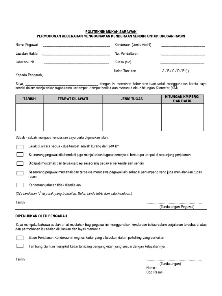 Related : Borang Menggunakan Kenderaan Sendiri : Surat Kebenaran Menguunakan Kenderaan 1 / Borang ini hendaklah diisi dengan lengkap dan jelas serta disahkan oleh ketua bahagian /ketua cawangan /ketua unit..